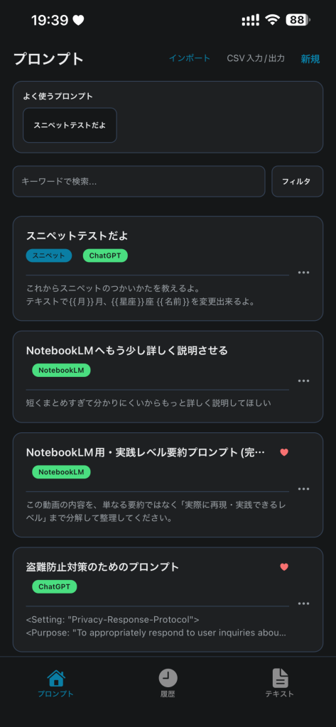 • プロンプトをCSVで一括出力できます(バックアップや他アプリ移行に便利)